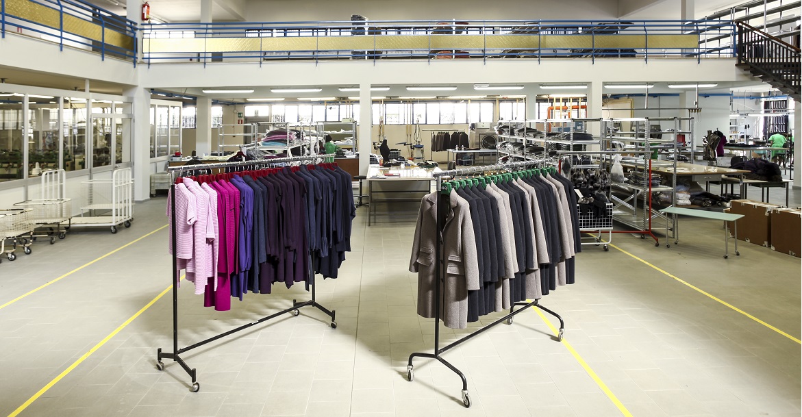 indoor clothing factory, clothes hanging