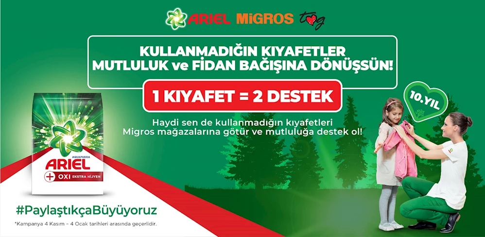Ariel, Migros ve Toplum Gönüllüleri Vakfı (TOG) iş birliğiyle gerçekleşen “Kıyafet Bağışı Kampanyası” “Bu yıl da 4 Kasım 2021- 4 Ocak 2022 tarihleri arasında bağışlanan kıyafetler Migros Mağazaları’nda toplanıp önce Ariel ile yıkanacak. Yeni gibi tertemiz olan kıyafetlerin, Ocak ayından itibaren Toplum Gönüllüsü gençler tarafından Türkiye’nin farklı bölgelerindeki ihtiyaç sahiplerine ulaştırılması amaçlanıyor. Üstelik bu yıl Ariel, kıyafet bağışlarına teşekkür olarak Ariel-Migros Ormanı’na fidan bağışında da bulunuyor.