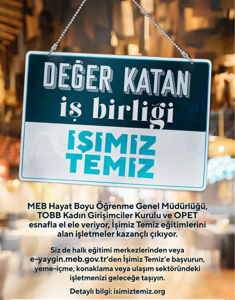 Millî Eğitim Bakanlığı Hayat Boyu Öğrenme Genel Müdürlüğü (HBÖGM), Türkiye Odalar ve Borsalar Birliği (TOBB) Kadın Girişimciler Kurulu ve OPET’in iş birliğinde hayata geçirilen “İşimiz Temiz Projesi” kapsamında düzenlenen eğitimlerle bugüne kadar 60 bini aşkın işletme temsilcisine ulaşıldı. Konaklama, yiyecek-içecek ve ulaşım sektöründeki mikro işletmelere yönelik olarak 2021 yılında hayata geçirilen proje ile işletmelerin hijyen standartlarının yükseltilmesi, bu işletmelere duyulan güvenin artırılması ve böylelikle işletme gelirlerine destek sağlanması hedefleniyor. Yeme içme, konaklama ve ulaşım sektörleri işletmecileri ve çalışanlarına yönelik hijyen eğitim içeriklerinin halk sağlığı profesörleri tarafından hazırlandığı projede, eğitimler ücretsiz ve herkese açık olarak halk eğitimi merkezleri tarafından gerçekleştiriliyor.