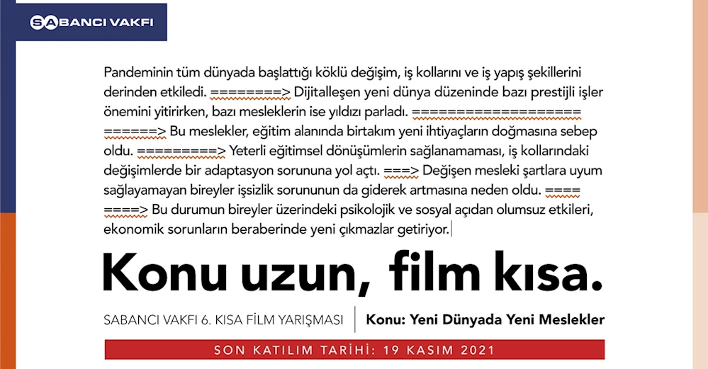 Sabancı Vakfı’nın toplumsal sorunlara sanat aracılığıyla dikkat çekmek amacıyla 2016 yılından bu yana düzenlediği Kısa Film Yarışması’nın 2021 yılı başvuruları başladı. “Konu Uzun Film Kısa” sloganı ile altıncısı gerçekleştirilecek Sabancı Vakfı Kısa Film Yarışması’nın teması “Yeni Dünyada Yeni Meslekler” olarak belirlendi. Bu yıl Kısa Film Yarışması’na başvurular 19 Kasım tarihine kadar yapılabilecek.
