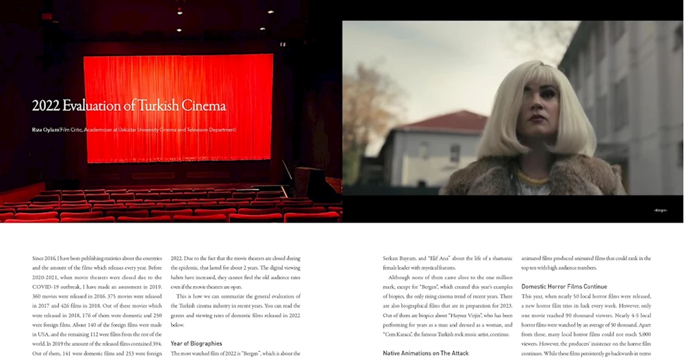 Türk sinemasının 2022 yılı değerlendirmesi; Güney Kore’de yayımlanan Culture dergisinde Korece ve İngilizce olarak, İran’da yayımlanan Film dergisinde ise Farsça yayımlandı. Sinema yazarı ve akademisyen Rıza Oylum’un kaleme aldığı 2022 yılında Türkiye’deki sinema sektörü incelemesini içeren yazıda; 2022’de kaç filmin vizyona girdiği, en çok izlenen filmler, Bergen filmi gibi biyografi filmlerinin çok talep görmesi, komedi filmlerinin izlenme oranında yaşanan düşüş ve korku filmlerinin üretimi üzerine yoğunlaşıldı. Yazıda; yerli animasyonların sayılarının çoğalması ve Arthouse filmlerin gişede başarı gösterememesine rağmen Emin Alper’in yönettiği Kurak Günler’in vizyon başarısının altı çiziliyor.